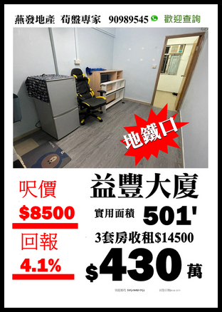 01. 益豐大廈高層 實用501尺 單邊3套 連租約14500 售$430萬 地鐵口 https://maps.app.goo.gl/kv52CafMjKeeSCBA6 |